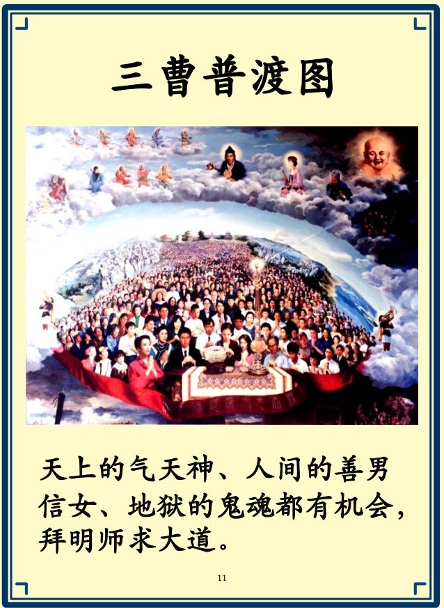 著名善書《地獄遊記》中記載一項天大的好消息 : 濟公活佛告訴世人三曹普度,上度氣天河漢星斗,中度人間芸芸眾生,下度幽冥鬼魂,天人共忙於此時。聖門宏開,真道普降,人間處處善堂林立,道氣家家可聞,斯時也,文化復興,古道重行,呈現一片吉祥瑞象,地府鬼魂正待此時得救。